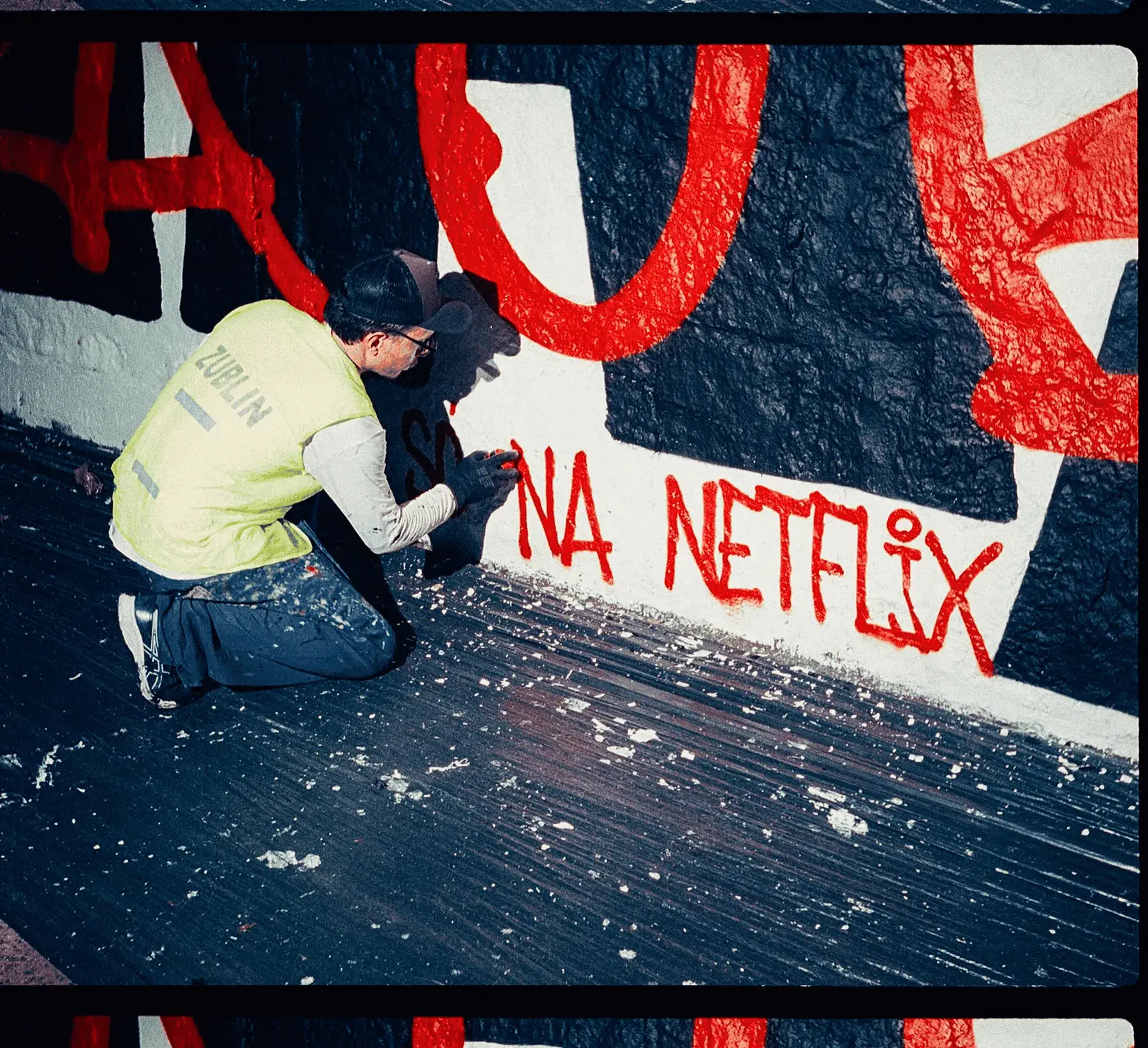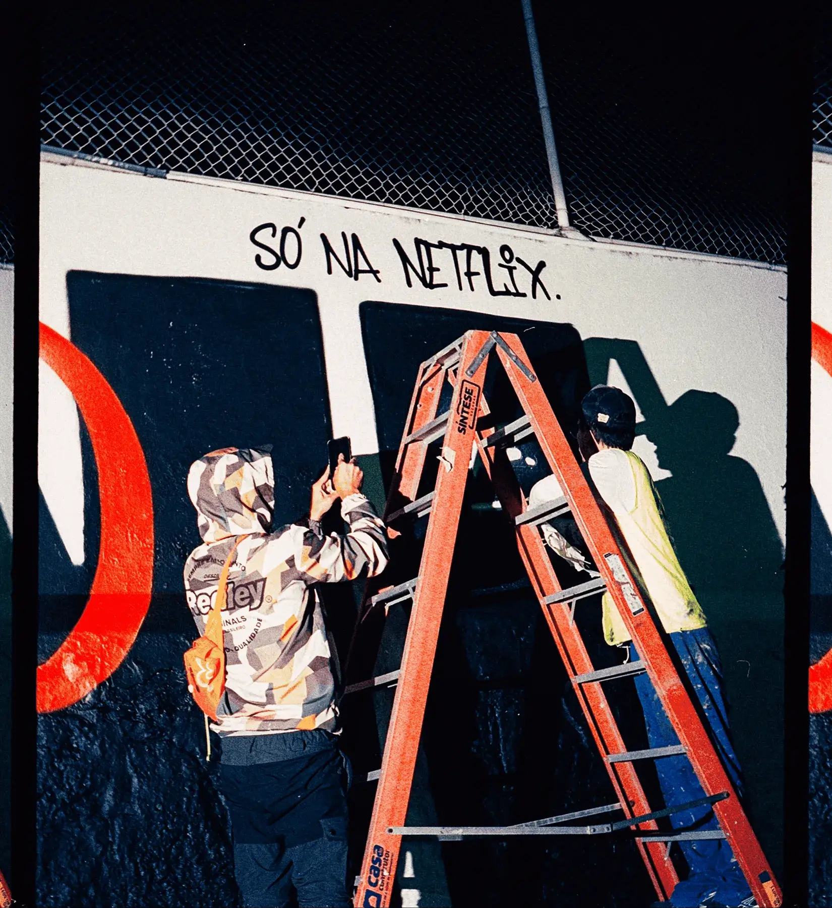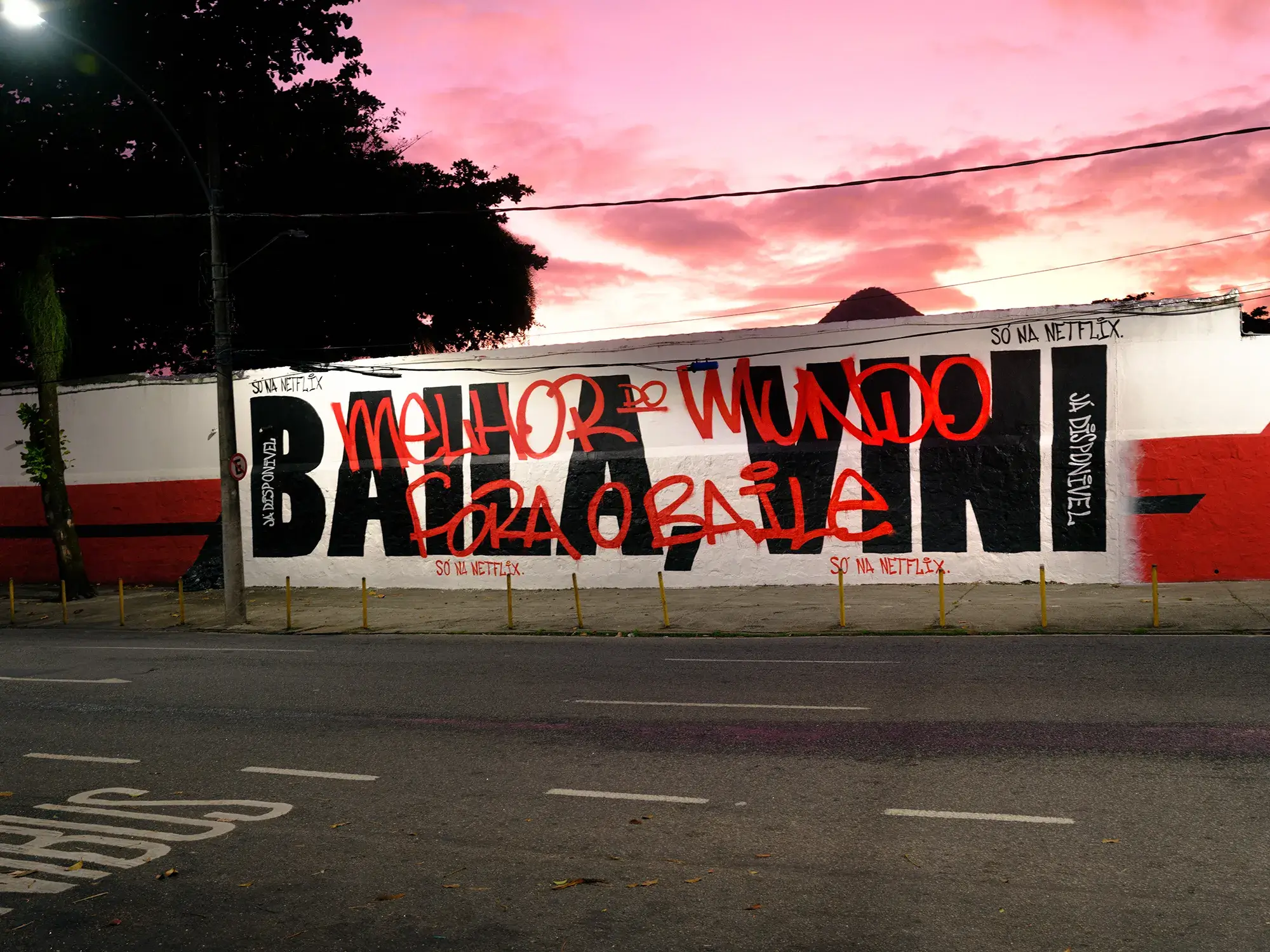 Primeiro, instalamos o lettering oficial do filme com precisão técnica. Na sequência, em uma intervenção de guerrilha durante a madrugada, o mural foi "atropelado" com a frase: "O melhor do mundo, fora o Baile" — acompanhada da data e logo da Netflix.